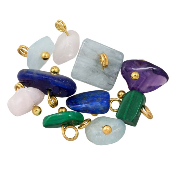 This charm mix is a random mix and may contain natural malachite, amethyst, rose quartz, lapis lazuli and aquamarine. The charms have a goldcolored eyelet.