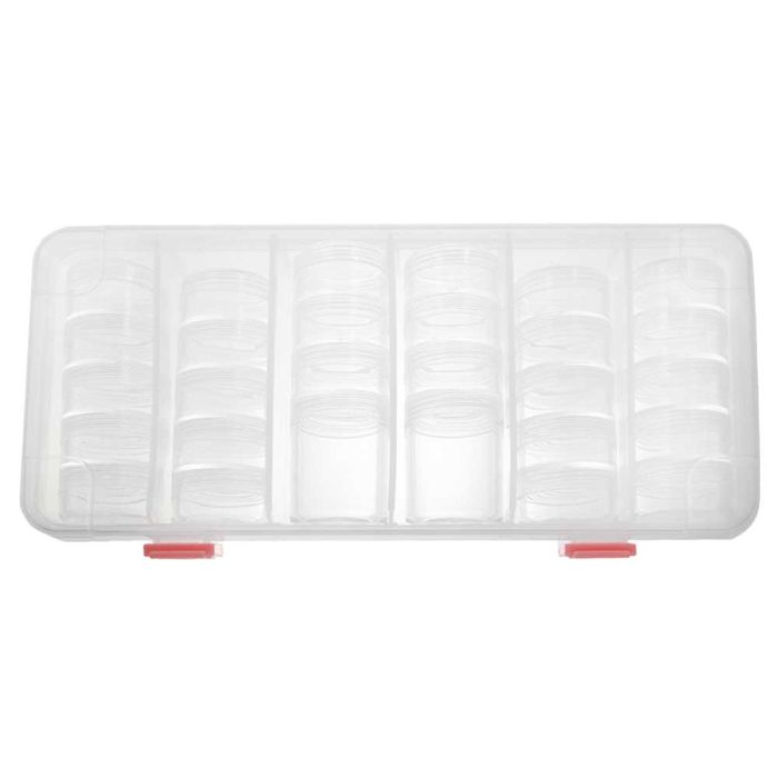 Practical storage box with 28 compartments. The dimensions of the box are approx. 26.5 x 13 x 4.5 cm, big recipients (5.2 x 10.5 cm), small recipients (3.9 x 3 cm).